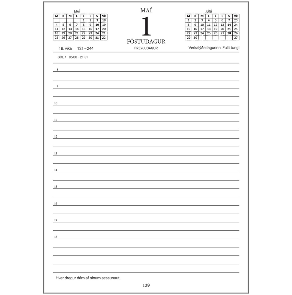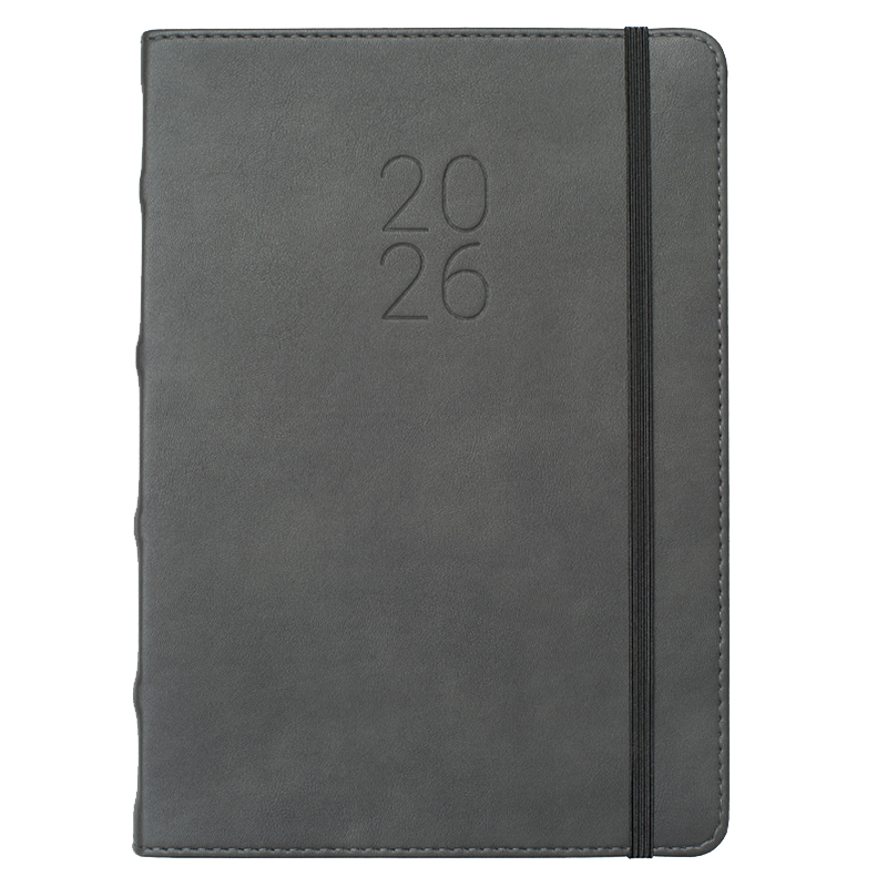 Hrafn harðspjalda A5 dagbók. Einn dagur á síðu og viku-og daganúmer. Málshættir og lands- og svæðisnúmer. Ársdagatal 2026-2027. Yfirlit yfir tungl, sjávarföll, vegalengdir o.fl.