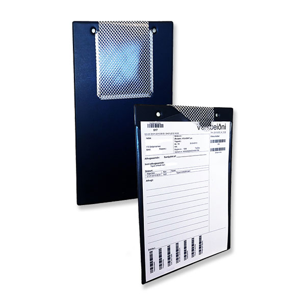 Sérhönnuð verkstæðismappa. Að framan er vasi fyrir upplýsingar um bíl eða vinnuvél sem á að gera við. Í bakinu er vasi fyrir bíllykil.